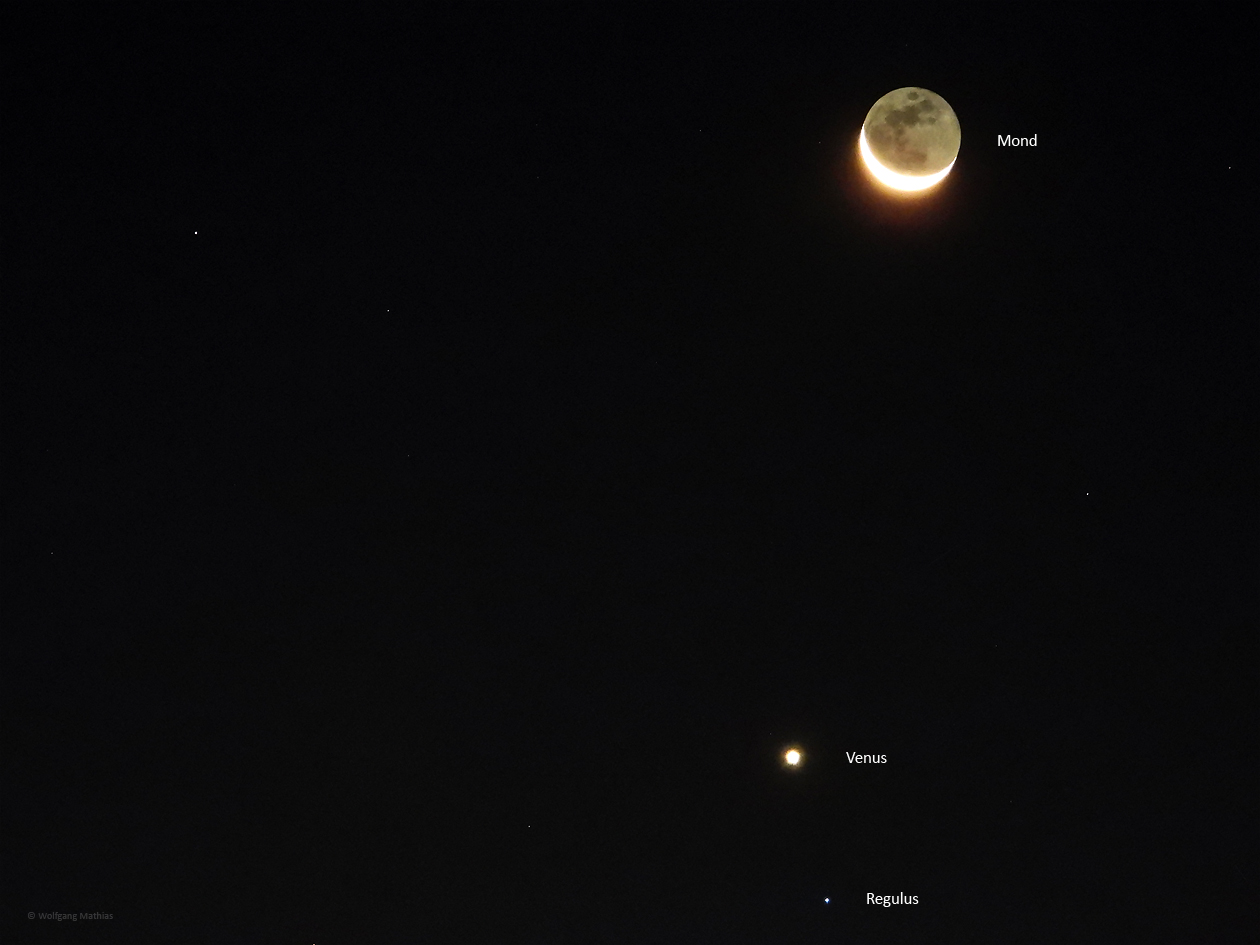 Der Mond (mit 8 % Sichtbarkeit), die Venus (sie ist der hellste Planet am Nachthimmel) und Regulus (der hellste Stern im Sternbild Löwe) stehen sehr nahe zusammen.
