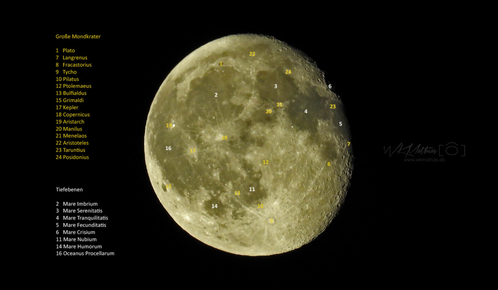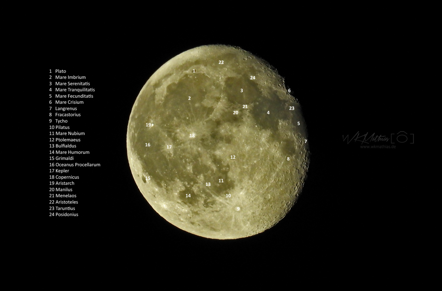 Hier sieht man die Mond-Vorderseite, die uns zugewandte Seite. Die Ansicht variiert nur minimal.Die Tiefebenen- und großen Mondkrater habe ich beschriftet.